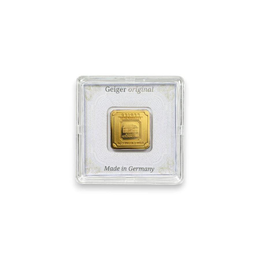 The 5 Gram Gold Geiger Original Bar is a fine example of the exceptional quality and security for which Geiger Edelmetalle AG is renowned, minted with a .9999 fine gold purity. Sealed within a carded assay, each bar's authenticity, weight, and purity are guaranteed, providing investors and collectors with confidence in their acquisition. This bar features the distinguished Geiger Edelmetalle design, including the iconic Schloss Güldengossa, reflecting the company's long-standing tradition and commitment to excellence in precious metal craftsmanship. Advanced security features, such as UV-light-readable markings and a unique serial number on the assay card, ensure the highest level of investment protection. The 5 Gram Gold Geiger Original Bar, with its compact size and high gold content, offers a valuable entry point for those looking to invest in gold, combining the allure of precious metal with the innovative security and quality assurance of one of the world's leading precious metal refineries.