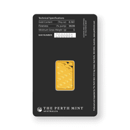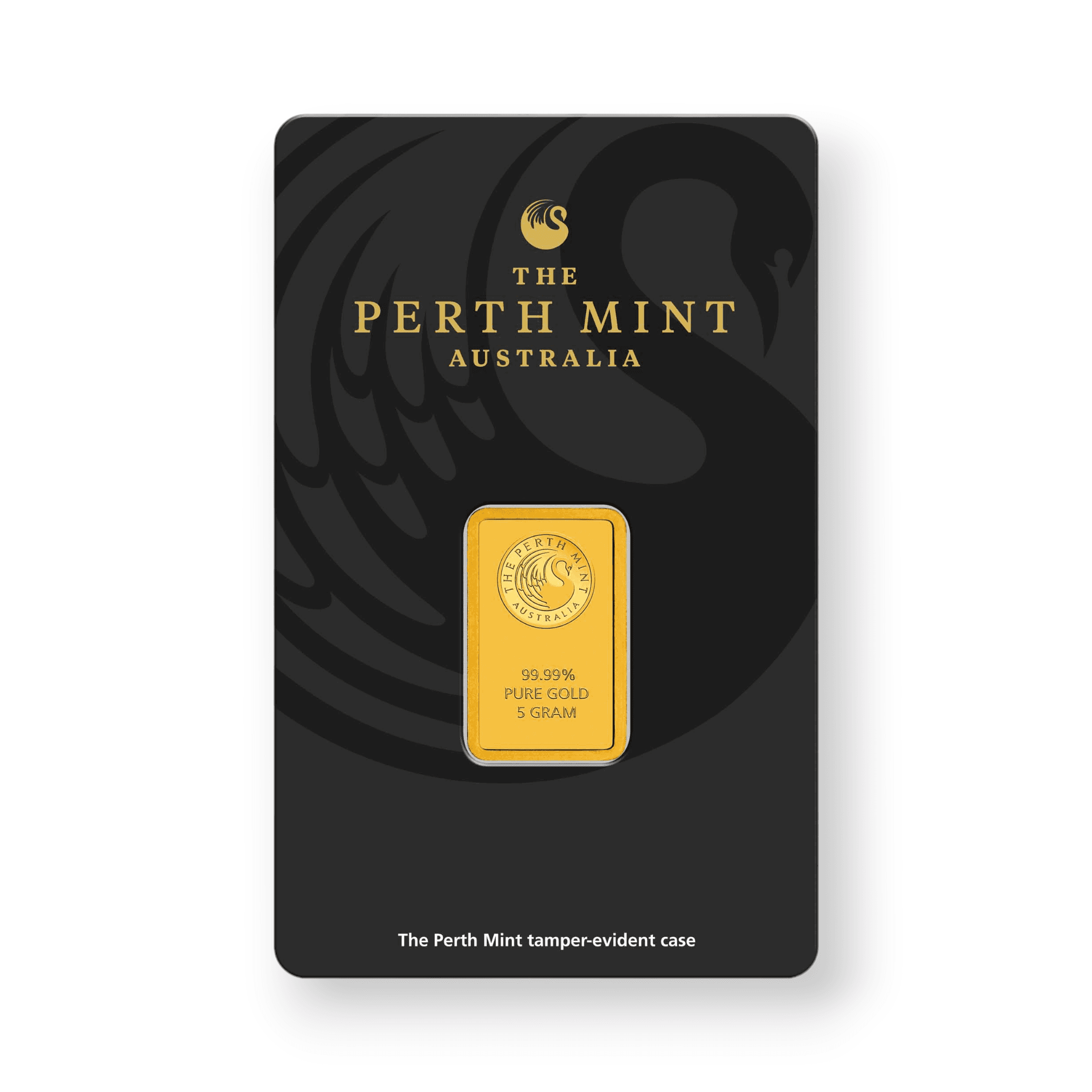 The 5 Gram Perth Mint Gold Bar, sealed in an assay card and featuring a .9999 fine purity, is a premium product from the renowned Perth Mint in Australia. This bar contains 5 grams of gold with an exceptionally high purity of 99.99%, reflecting the Perth Mint's high standards of quality and excellence in precious metal refining. The design of the bar typically features the mint's signature swan logo or other iconic Australian symbols, adding to its aesthetic and collectible appeal. Enclosed in a tamper-evident assay card, the bar is not only protected but also authenticated, with the card providing essential information such as the bar's weight, purity, and a unique serial number, ensuring its authenticity and quality. The 5 Gram Perth Mint Gold Bar is highly sought after by investors and collectors for its combination of fine craftsmanship, high gold purity, and the trusted reputation of the Perth Mint, making it an attractive option for those seeking to invest in gold.