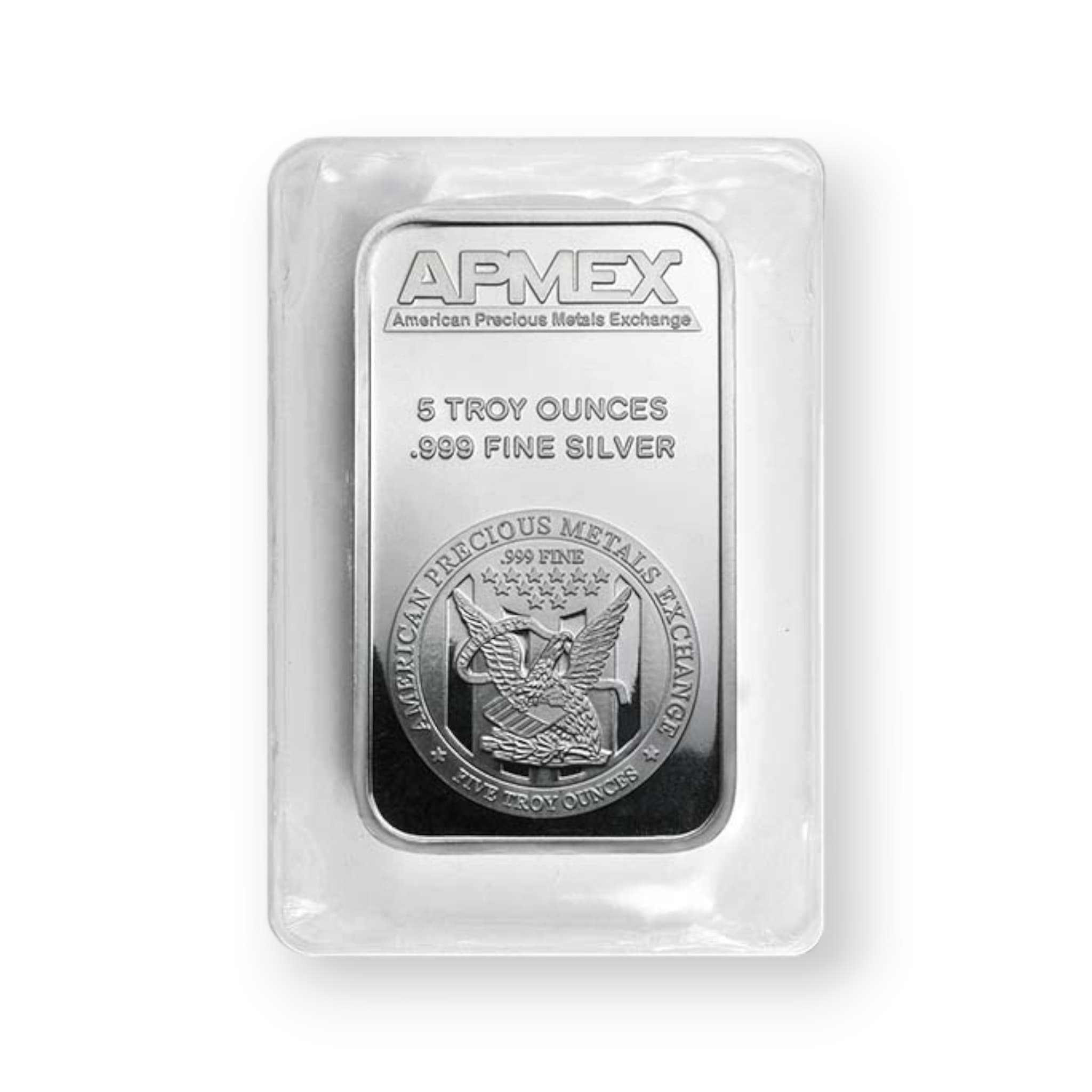 The 5 oz APMEX Silver Bar .999 Fine is a top-quality silver bullion product, produced by APMEX, a well-respected name in the precious metals industry. Each bar contains 5 troy ounces of .999 fine silver, ensuring high purity and value. APMEX bars are known for their precise weight and metal content, backed by the company's reputation for excellence and reliability. The bar features a sleek, modern design with the APMEX logo and weight/purity specifications stamped on its surface. This silver bar is an excellent choice for both investors looking to diversify their portfolios and collectors seeking a reliable and aesthetically pleasing asset.