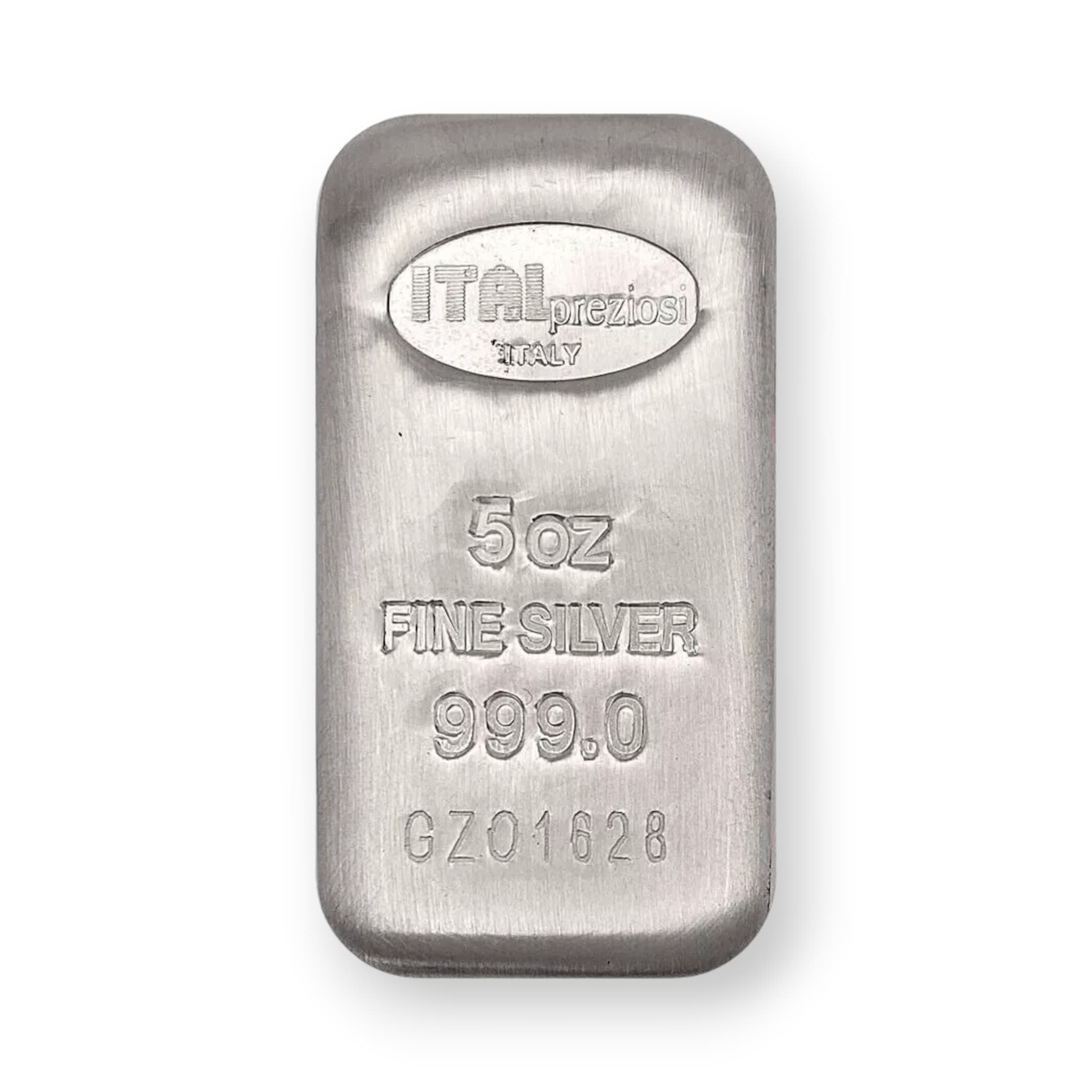 The 5 oz Silver Bar Italpreziosi is a high-quality investment product, minted in .999 fine silver and weighing 5 troy ounces (approximately 155.517 grams). Produced by Italpreziosi, a renowned Italian precious metals refiner, this silver bar is celebrated for its purity and craftsmanship. The obverse of the bar typically features the Italpreziosi logo, along with weight and purity details, providing assurance of its authenticity and value. The reverse side is usually plain, emphasizing the bar's sleek and practical design. Ideal for investors looking to diversify their portfolios with moderate amounts of silver, the 5 oz Silver Bar Italpreziosi combines the advantages of manageable size with significant value. Its high purity and the trusted reputation of Italpreziosi make this bar a reliable and desirable addition to any precious metals collection or investment strategy.