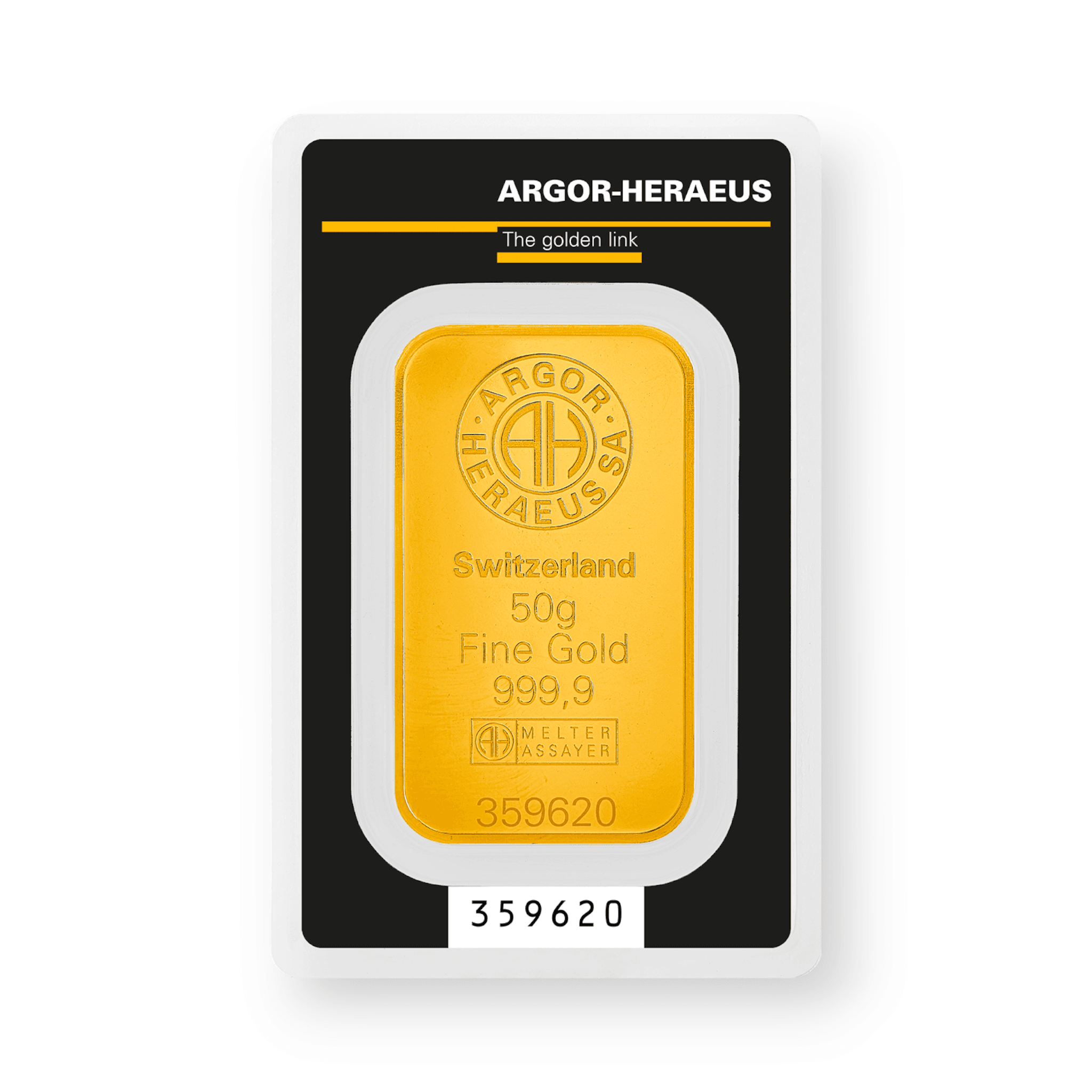 The 50 Gram Argor Heraeus Gold Bar, with a .9999 fine purity and sealed in a carded assay, is a substantial and prestigious product from the renowned Swiss refinery Argor Heraeus. This bar contains 50 grams of 99.99% pure gold, demonstrating the exceptional quality and standards upheld by Argor Heraeus. The gold bar is securely encased in a tamper-evident assay card, which not only protects the bar but also serves as a certificate of authenticity, detailing vital information like the bar's weight, purity, and a unique serial number for security and verification. This sizeable gold bar, with its high purity and the esteemed reputation of Argor Heraeus, is a sought-after item among investors and collectors, valued for its significant weight, the reliability of its assay certification, and the prestige of holding a high-quality gold product.