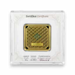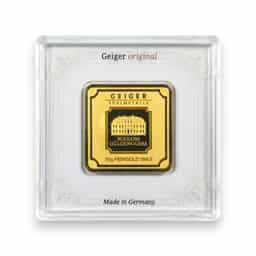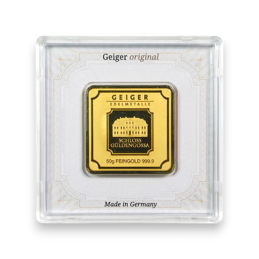 The 50 Gram Gold Geiger Original Bar represents a perfect fusion of high-quality precious metal investment and advanced security technology, all sealed within a carded assay for guaranteed authenticity and purity. Minted by Geiger Edelmetalle AG, a prestigious name in the world of precious metals, this bar is composed of .9999 fine gold, ensuring investors and collectors receive a product of exceptional purity. The inclusion of distinctive security features, such as UV-light-readable elements and a serialized hologram on the assay card, underscores Geiger's commitment to safeguarding the bar's integrity and the investor's peace of mind. Each bar's design elegantly showcases the Geiger Edelmetalle logo, coupled with the iconic image of Schloss Güldengossa, symbolizing the company's longstanding tradition and its dedication to blending historical craftsmanship with modern innovation. The 50 Gram Gold Geiger Original Bar, with its considerable weight and high gold content, is not just an investment in precious metal but also a testament to Geiger Edelmetalle's excellence in producing gold bars that are both secure and of unmatched quality in the precious metals market.