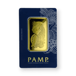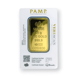 The 50 Gram Pamp Fortuna Gold Bar, boasting a .9999 fine purity and sealed in an assay card, is a premium product from PAMP Suisse, renowned for its exquisite craftsmanship and quality in the precious metals industry. This bar contains 50 grams of 99.99% pure gold, embodying PAMP's dedication to high purity standards. The Fortuna design, one of PAMP's most famous motifs, depicts the Roman goddess of fortune, symbolizing wealth and prosperity, and is renowned for its intricate artistry. Each bar is securely encapsulated in a tamper-evident assay card, which not only protects the gold bar but also includes a certificate of authenticity. This certificate provides essential details such as the bar's weight, purity, and a unique serial number for verification purposes. The 50 Gram Pamp Fortuna Gold Bar is a sought-after item among investors and collectors, valued for its combination of artistic design, high gold content, and the assurance of quality and authenticity provided by PAMP Suisse.