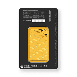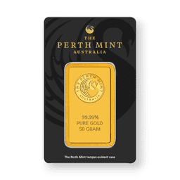 The 50 Gram Perth Mint Gold Bar, with a .9999 fine purity and sealed in an assay card, is a significant and high-quality offering from the Perth Mint, Australia's oldest operating mint. This gold bar contains 50 grams of gold at an exceptionally high purity level of 99.99%, reflecting the Perth Mint's commitment to producing superior gold products. The bar typically features the mint's iconic logo or other Australian heritage symbols, adding to its visual appeal and collectible value. Each bar is securely encased in a tamper-evident assay card, which not only ensures the protection of the gold but also serves as a certificate of authenticity. The card provides crucial details such as the bar's weight, purity, and a unique serial number, essential for verifying its authenticity. The 50 Gram Perth Mint Gold Bar is a desirable investment for those who appreciate the combination of a substantial amount of high-purity gold and the trusted reputation of the Perth Mint.