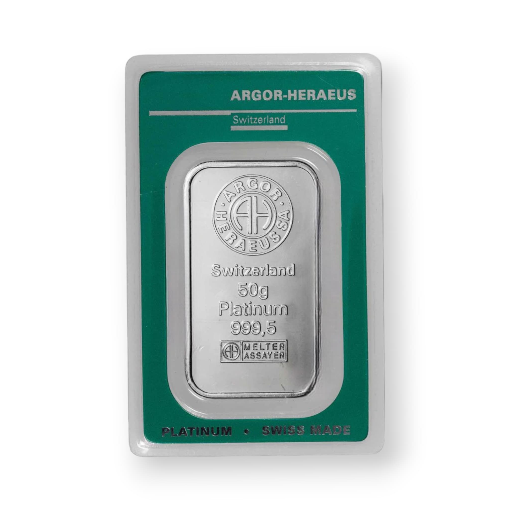 50 Gram Platinum Bar Argor Heraeus .9995 Fine Sealed in Carded Assay