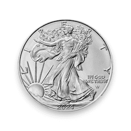 The American Silver Eagle 1 oz 2024 is a highly esteemed coin produced by the United States Mint. Each coin contains 1 troy ounce of .999 fine silver, making it a valuable and widely recognized investment product. The obverse of the coin features a powerful depiction of Lady Liberty walking towards the rising sun, symbolizing freedom and opportunity. The reverse showcases a majestic American bald eagle with outstretched wings, holding an olive branch and arrows, representing strength and peace. The American Silver Eagle is renowned for its high silver purity, iconic design, and legal tender status with a face value of $1. The 1 oz American Silver Eagle 2024 offers collectors and investors a tangible asset that embodies American heritage, excellence, and the enduring value of silver.