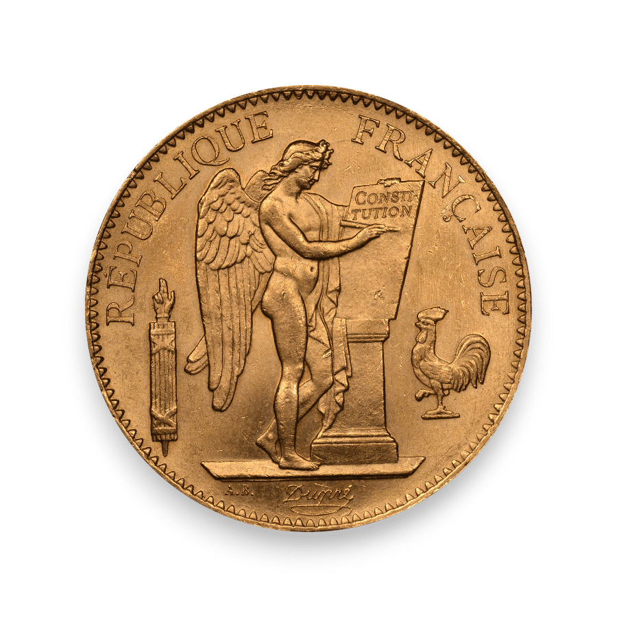 The French 100 Francs Gold Angel, minted from 1878 to 1914, is a coin renowned for its beauty and historical significance. The coin features the iconic design of the Standing Genius, also known as the "Lucky Angel," originally engraved by Augustin Dupré during the French Revolution. This design was believed to bring good fortune to its holders and was thus highly coveted. The coin weighs 32.258 grams and contains 90% gold, giving it a fine gold weight of 29.032 grams or just under an ounce (0.9334 ounces). As a numismatic piece, the French 100 Francs Gold Angel is sought after by collectors and investors alike for its artistry, gold content, and the legendary luck attributed to the design.