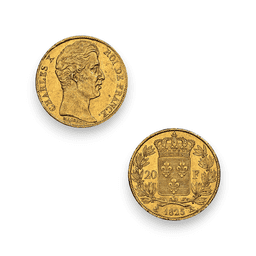 The French 20 Francs gold coin from the reign of Charles X, minted from 1825 to 1830, is a numismatic representation of the later Bourbon Restoration period. The obverse of the coin features a portrait of King Charles X, the last Bourbon king of France, often shown with a laurel crown, symbolizing peace and triumph, and embodying the traditionalist policies he pursued. This period’s coins are distinguished by the inclusion of the king’s title "Charles X Roi de France," which underscores the monarch’s divine right to rule. Made with a gold purity of 90% (21.6 karats), the coin contains 0.1867 troy ounces (5.805 grams) of gold. The reverse design is typically adorned with the royal coat of arms, the crown, and the mantle, alluding to the opulence and authority of the monarchy. The Charles X gold coins are prized for their historical significance, as they were among the last to bear the effigy of a Bourbon king before the July Revolution of 1830, which led to a more constitutional and less absolute monarchy in France.