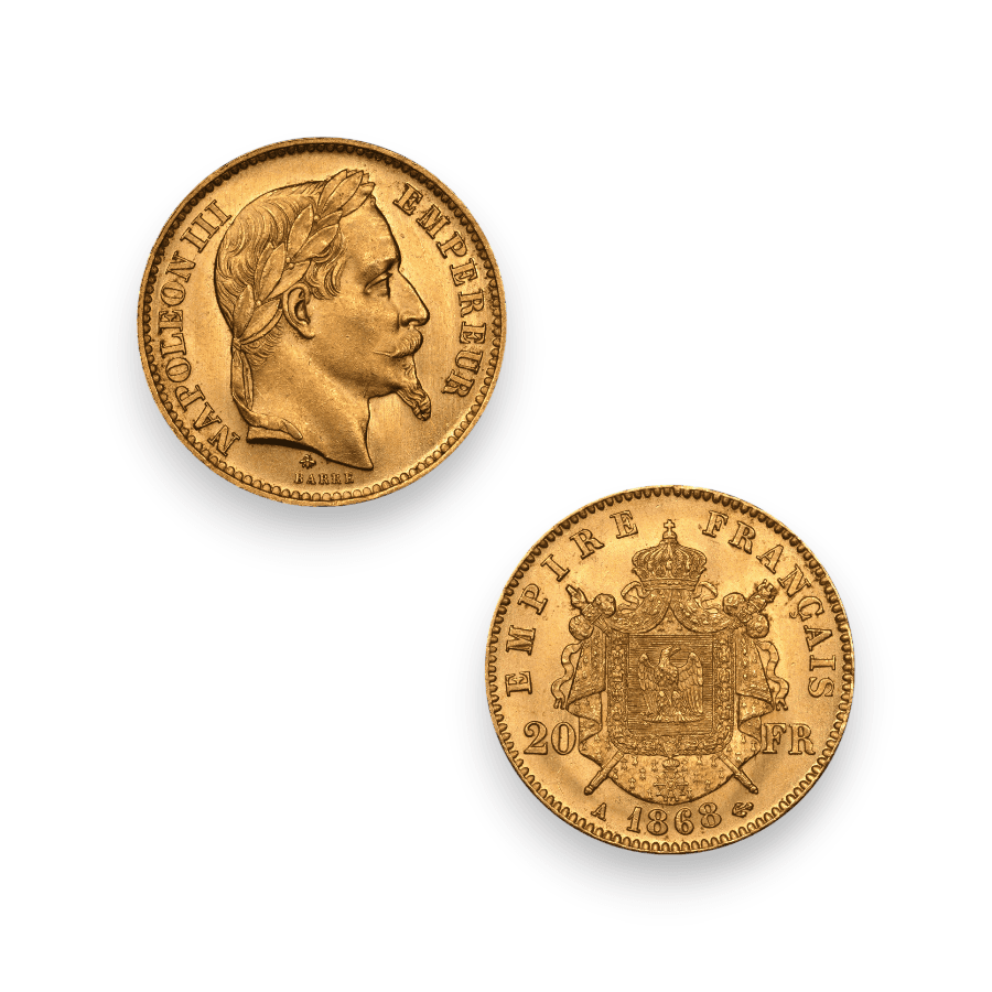 The French 20 Francs gold coin from the Napoleon III era, spanning 1852 to 1870, is a notable numismatic piece that reflects the grandeur of the Second French Empire. The coin features the portrait of Emperor Napoleon III, nephew of Napoleon Bonaparte, with variants including the bareheaded and laureate (crowned with laurel) designs, indicative of his imperial authority and the era's neoclassical aesthetic. Minted with a gold purity of 90% (21.6 karats), each coin holds an actual gold weight of 0.1867 troy ounces (5.805 grams). The reverse typically depicts the imperial eagle, a symbol of the Bonaparte dynasty, and the denomination framed by a wreath, echoing the empire's military might and political power. These coins were part of the Latin Monetary Union, which standardized the gold content among several European countries, and remain a tangible connection to the opulence and historical upheavals of 19th-century France.
