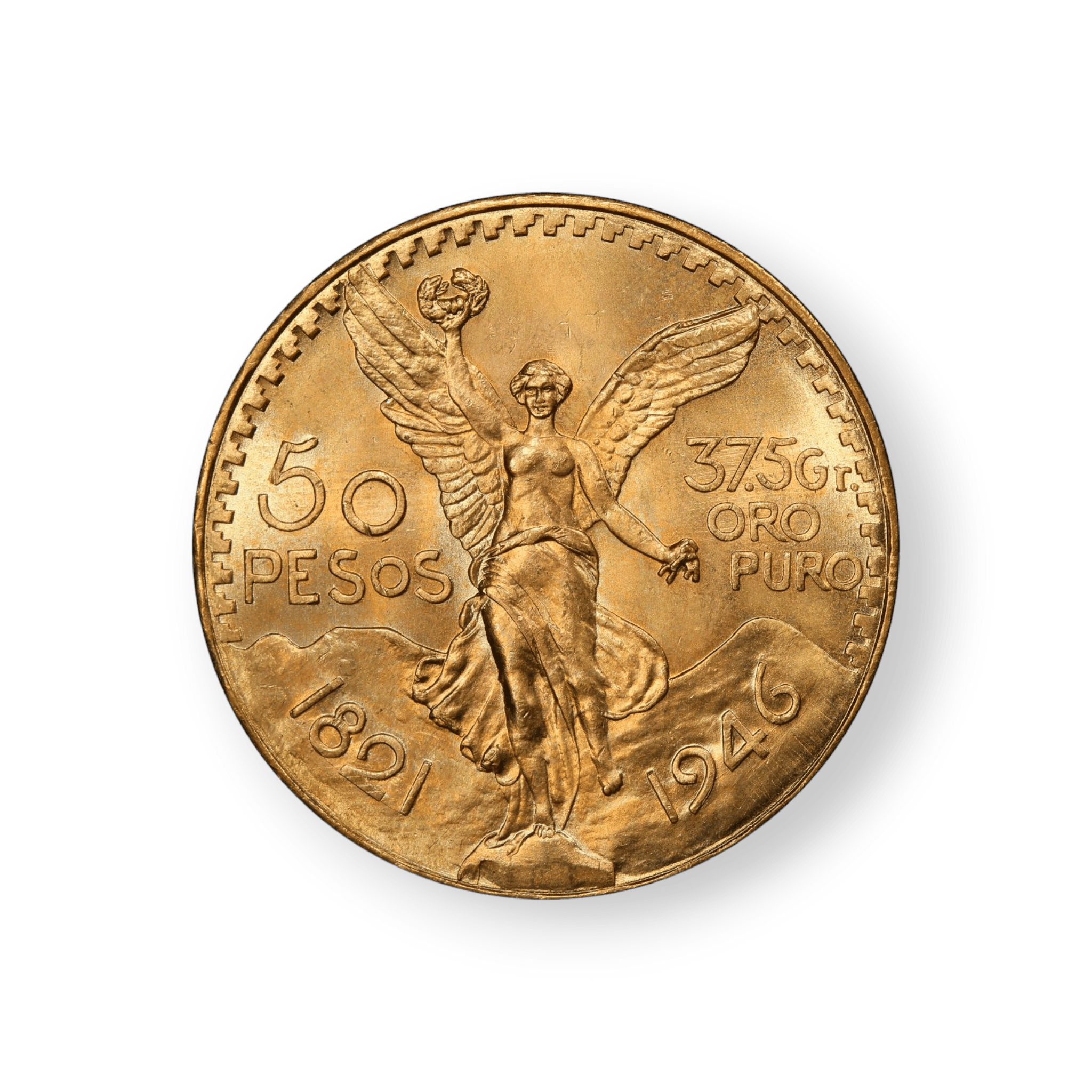 The Random Date Mexico 50 Peso Gold Coin is a historic and coveted numismatic treasure, minted by Mexico to commemorate its rich cultural heritage. Weighing 1.2057 ounces (37.5 grams) of pure gold, this coin boasts a diameter of 37 mm, making it an impressive and substantial piece. The obverse of the coin features the iconic Winged Victory "Angel of Independence" statue, symbolizing Mexico's struggle for independence and freedom. The reverse showcases the Mexican coat of arms, displaying an eagle perched atop a cactus while devouring a serpent, as depicted in the legend of the founding of Tenochtitlan, modern-day Mexico City. This extraordinary gold coin holds both historical significance and intrinsic value, making it a prized possession for collectors and a sound investment for those seeking to hold precious metals with enduring worth. Please note that the specific year of minting may vary, as this coin is randomly selected from various dates of issuance.
