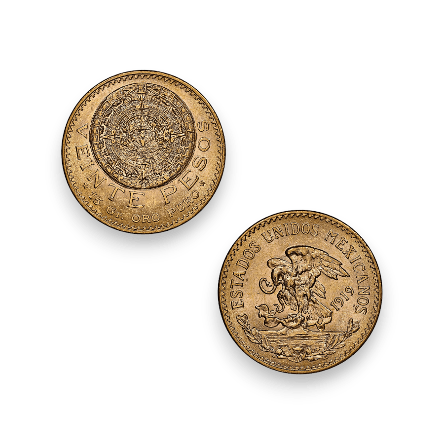The Mexico Gold 20 Peso Coin is a captivating emblem of Mexico's rich cultural and historical tapestry. Struck in .4823 troy ounces of .900 fine gold, this coin carries both monetary and numismatic value. The coin's obverse typically boasts the image of Mexico's national symbol, the Golden Eagle perched on a cactus, devouring a snake — a potent representation of indigenous Aztec mythology and the foundation legend of Mexico City. The reverse frequently showcases the radiant Sun Stone or Aztec Calendar, a tribute to Mexico's ancient civilizations and their astronomical prowess. When denoted as "Random Date," it signifies that the exact year of issue is contingent on the seller's inventory, offering collectors and investors a genuine slice of Mexican heritage with each purchase.