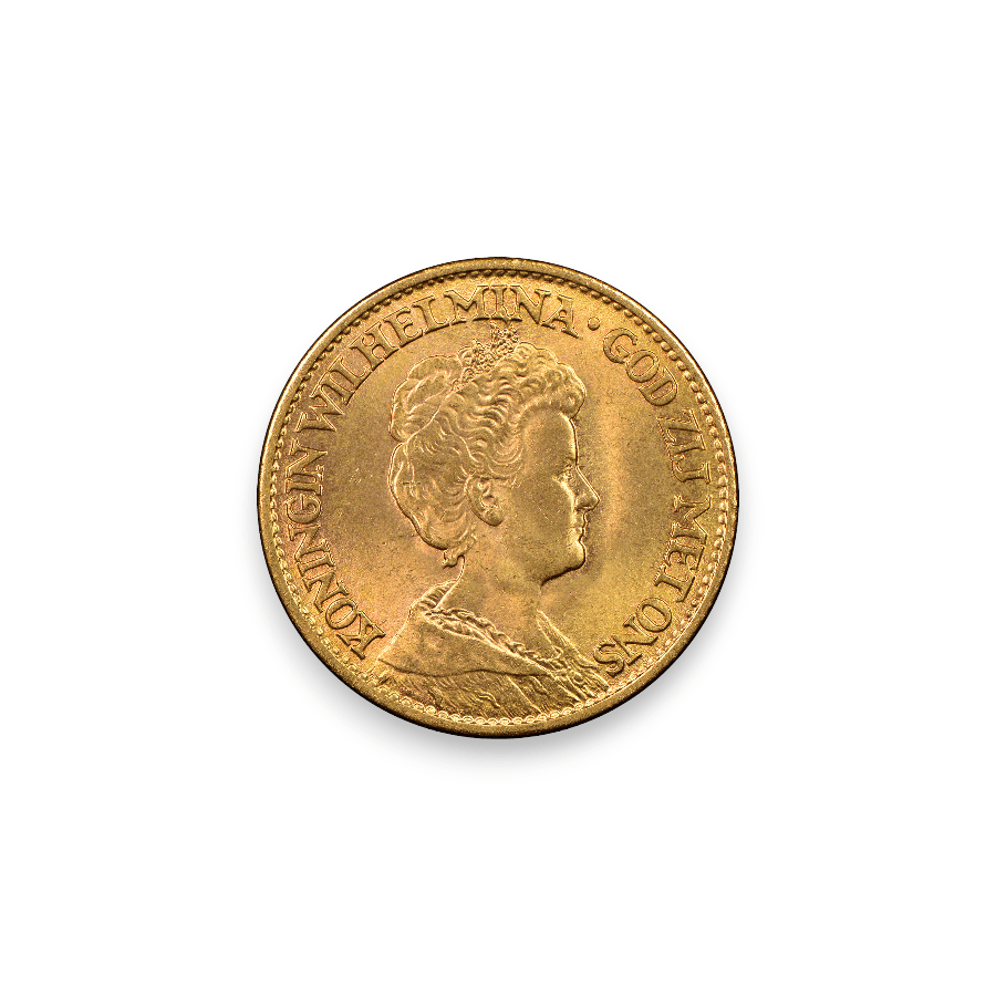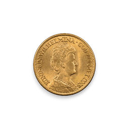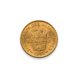 The Netherlands (Holland) 10 Guilder gold coin, also known as the Dutch 10 Gulden or Gouden Tientje, is a historic gold coin that was issued in various years and has become a popular collector's item. These coins were made of .900 fine gold, meaning they contain 90% gold and 10% copper, and they generally weigh about 6.72 grams, with a gold weight of approximately 0.1947 troy ounces. The obverse of the coin typically features a portrait of the reigning monarch of the Netherlands at the time of minting, while the reverse usually depicts the Royal Dutch Coat of Arms along with the denomination and date. The design and the monarch portrayed have changed over the years, with notable examples including coins bearing the likeness of King Willem III, Queen Wilhelmina, and later Queen Juliana.
