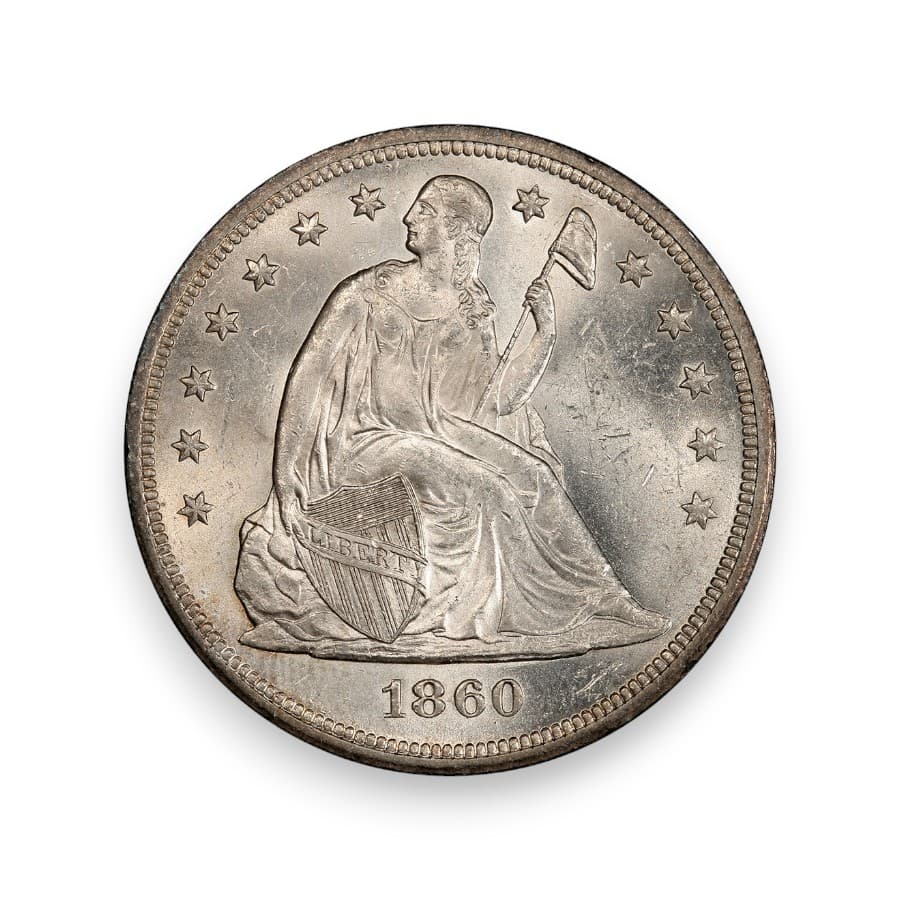 The Seated Liberty Silver Dollar, minted between 1839 and 1873, is a classic and historic American coin composed of 90% silver and 10% copper. Each coin weighs 26.73 grams, containing approximately 0.7734 troy ounces of pure silver. Designed by Christian Gobrecht, the obverse features Lady Liberty seated on a rock, holding a shield and a Liberty cap on a pole, symbolizing freedom and preparedness. The reverse showcases a heraldic eagle with a shield on its chest, clutching arrows and an olive branch, representing strength and peace. The Seated Liberty Silver Dollar is highly prized by collectors for its historical significance, intricate design, and silver content. These coins are an important part of U.S. numismatic history and are valued for both their aesthetic appeal and intrinsic silver value, making them a treasured addition to any collection or investment portfolio.
