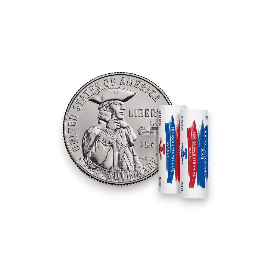 In recognition of the 2026 Semiquincentennial marking 250 years of the United States, the U.S. Mint is issuing five new quarters celebrating the nation’s history, including the second release in the series—the Revolutionary War quarter—honoring the resilience and determination to overcome the trials of war in pursuit of liberty. This two-roll set includes 80 circulating-quality coins struck at the United States Mints in Denver and Philadelphia, offering collectors a convenient way to acquire both mint variations from this one-year-only commemorative program featuring special designs across most circulating denominations. The obverse of the 2026 Revolutionary War quarter features George Washington, the nation’s first President and Commander-in-Chief of the Continental Army, along with the inscriptions “E PLURIBUS UNUM,” “IN GOD WE TRUST,” and “1776 ~ 2026.” The reverse depicts a Continental Army soldier at Valley Forge, Pennsylvania, symbolizing perseverance through hardship following defeats such as the Battle of Brandywine and the brutal winter encampment of 1777–1778, with inscriptions “UNITED STATES OF AMERICA,” “LIBERTY,” “25¢,” and “REVOLUTIONARY WAR.”