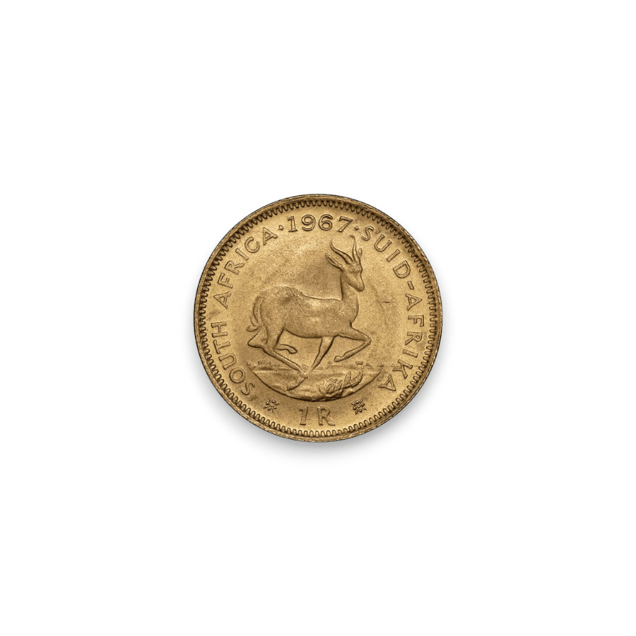 The South African 1 Rand Gold Coin is a desirable piece among collectors and precious metal investors, introduced in 1961 when South Africa became a republic and the decimal system was adopted. The coin is made from 22-karat gold, which is an alloy of 91.67% gold with the remainder being copper, giving it added durability and a distinct color. The 1 Rand gold coin features the well-known Springbok antelope on one side, which is a national symbol of South Africa, and the portrait of Jan van Riebeeck, a Dutch settler and founder of Cape Town, on the other. These coins are no longer minted for circulation but are sought after as both collectors' items and for their gold content, which is typically 0.1177 troy ounces per coin.