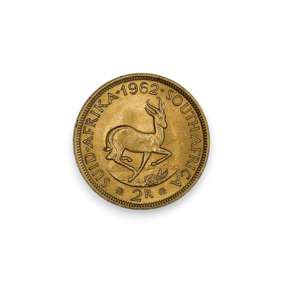 The South African 2 Rand Gold Coin is a captivating numismatic item, introduced in 1961 when South Africa became a republic. These coins were minted until 1983 and are composed of 22-karat gold, containing 0.2354 troy ounces of pure gold. The obverse side of the 2 Rand coin typically features the effigy of Jan van Riebeeck, a Dutch colonial administrator and founder of Cape Town, while the reverse showcases a springbok antelope, which is a national symbol of South Africa. The 2 Rand Gold Coin holds both collector value due to its historical significance, as well as investment appeal based on its gold content, making it of interest to both coin collectors and precious metal investors.
