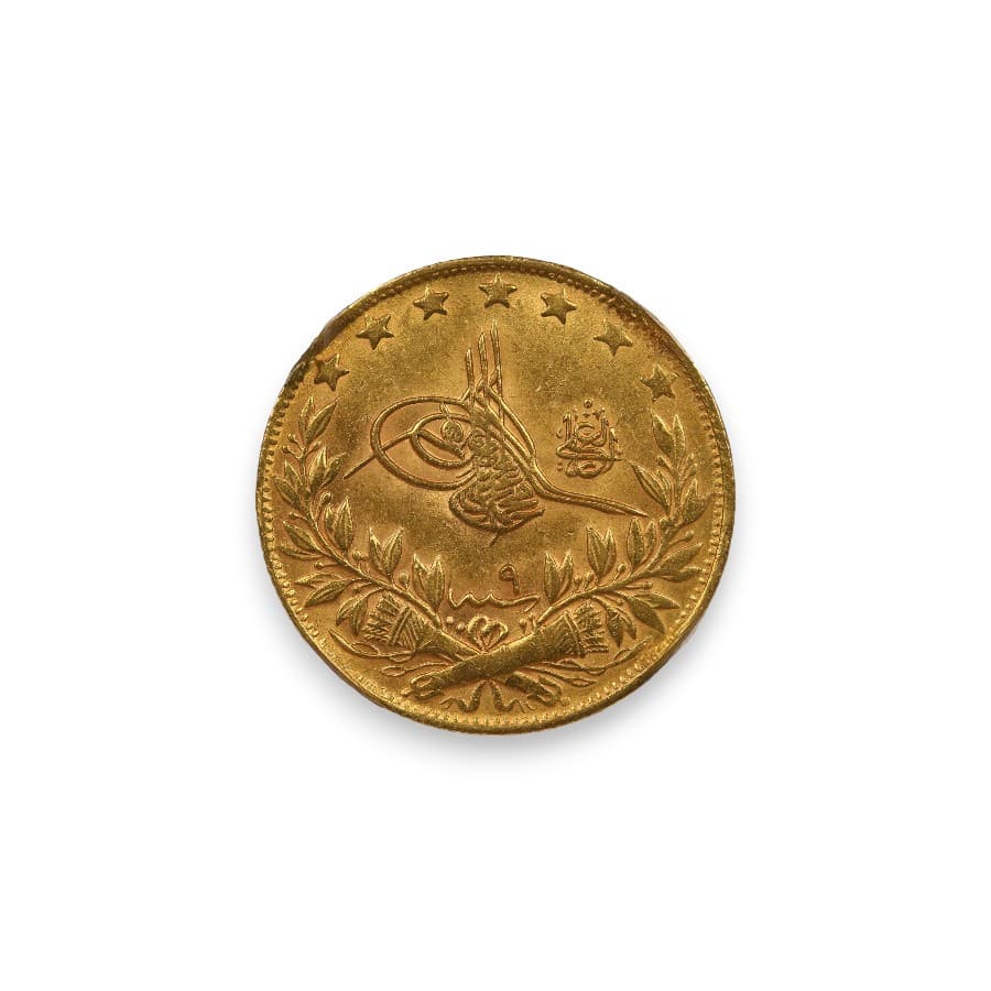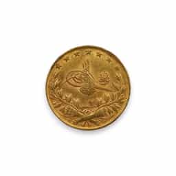 The Turkish (Ottoman Empire) Gold 100 Kurush coin, introduced during the reign of Sultan Abdul Hamid II in the late 19th century, is a significant piece of Ottoman numismatic history. Struck in high-quality gold, the coin typically features intricate designs, including Islamic inscriptions and the tughra, the sultan's calligraphic monogram, symbolizing his authority. Weighing approximately 7.2 grams and measuring around 22 millimeters in diameter, the 100 Kurush coin played an important role in the empire's economy. Its production continued into the early 20th century, making it a valuable collector's item today, reflecting the rich cultural and historical heritage of the Ottoman Empire.